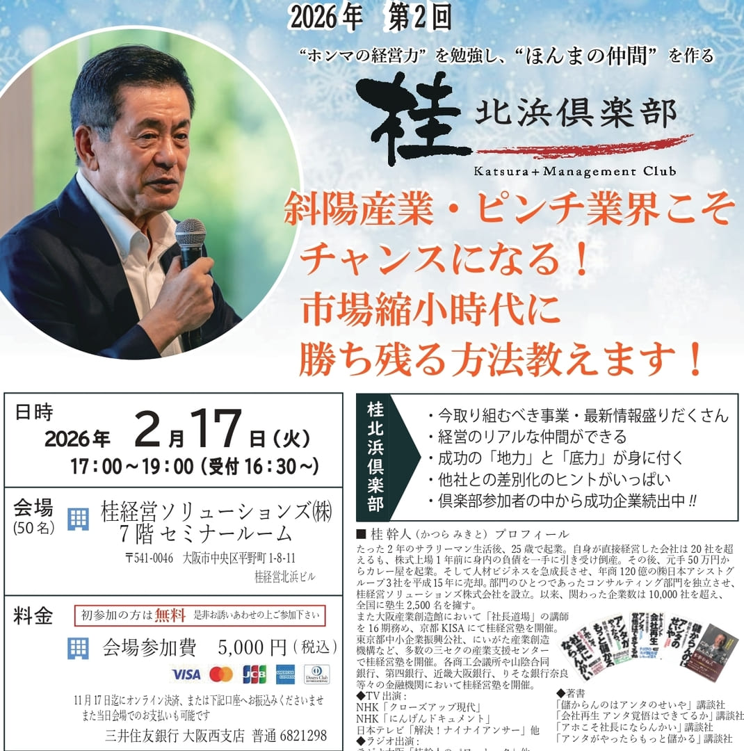 2.銀行振込の場合、2月15日までに下記へお振込みください 三井住友銀行 大阪西支店 普通 6821298「桂経営ソリューションズ」 3.当日会場にてお支払いください(現金またはクレジットカード決済がご利用いただけます) |